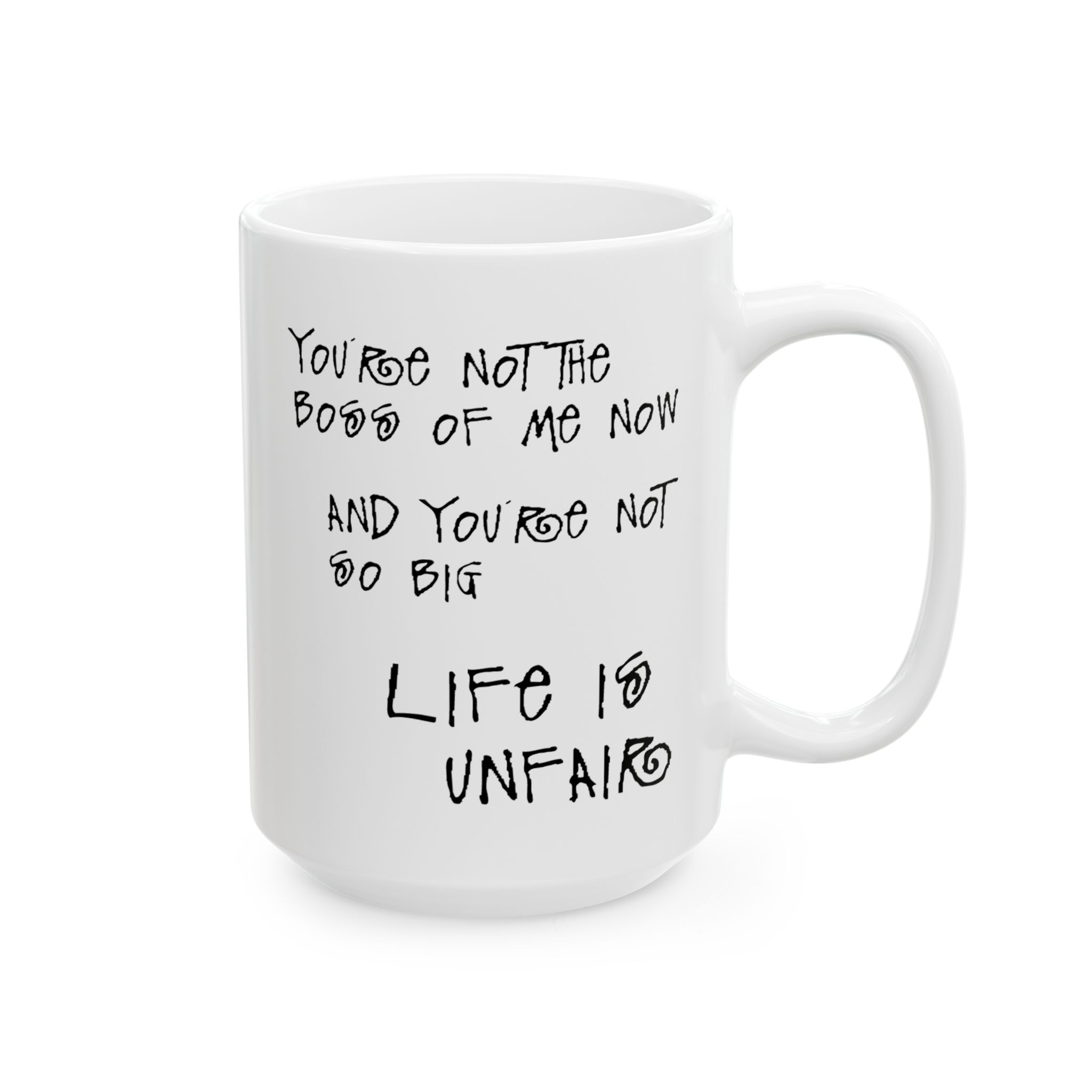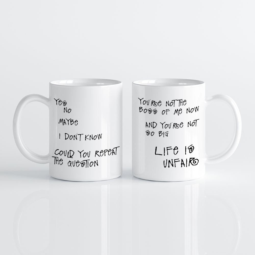 With a raw, handwritten-style font, the design wraps around the mug like a stream of consciousness straight out of Malcolm’s head. It’s perfect for mornings when decisions are hard, authority is questionable, and life feels a little unfair.